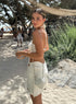 - CENA IN SPIAGGIA: Sandali piatti, gioielli delicati, pochette in paglia.