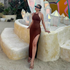 Scivola in un'aura di grazia. Questo abito, leggero come un sussurro, cattura la luce ad ogni tuo movimento, creando una sinfonia di eleganza.
