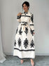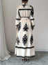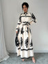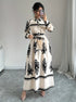 Lasciati avvolgere dall'eleganza fluida di questo abito, un capolavoro di design che celebra la tua unicità. Con la sua stampa distintiva e la cintura a nodo che accentua la vita, ti sentirai sofisticata e a tuo agio in ogni occasione.