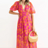 Lasciati avvolgere dalla grazia eterea di questo abito maxi, un inno alla femminilità spensierata. La stampa floreale vibrante e la silhouette fluida danzano con ogni tuo passo, facendoti sentire radiosa in ogni occasione estiva.