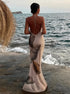 Lasciati avvolgere dalla grazia fluida di questo abito maxi, che cattura lo spirito spensierato delle giornate assolate e delle serate estive. Il suo design con scollo all'americana e la stampa unica creano un'eleganza senza sforzo, perfetta per le tue avventure estive.