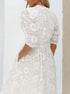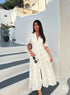 Avvolgiti nell'eleganza senza tempo dell'estate con il nostro incantevole abito midi. Il suo tessuto bianco squisitamente ricamato e il design abbottonato creano un look sofisticato, perfetto per serate al chiaro di luna o brunch raffinati.